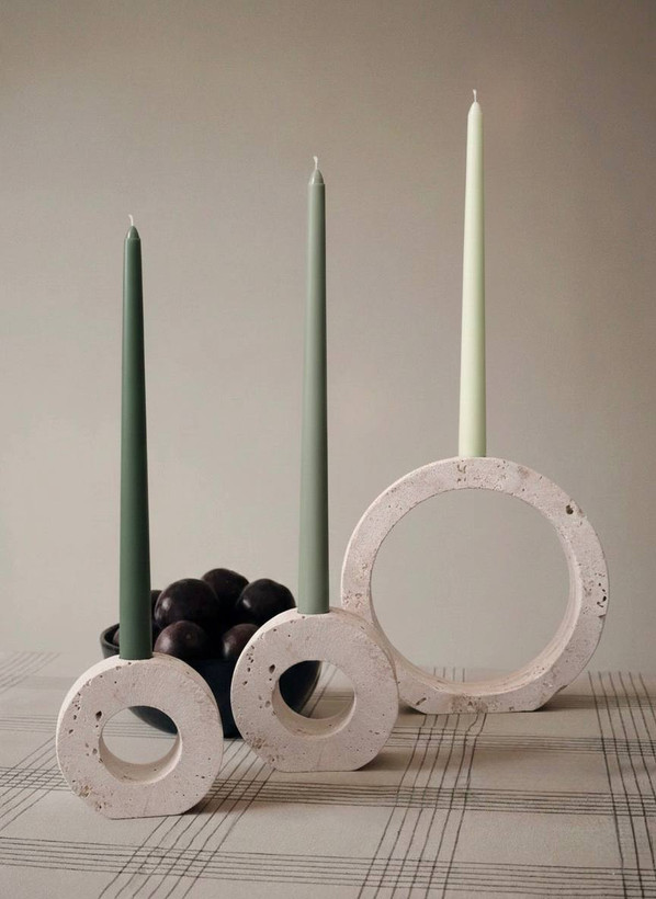 این شمعدانهای حلقهای ، نور شمع را به شکل هنری بازتاب میدهند و فضایی گرم و دلنشین ایجاد میکنند. طراحی مینیمال و طبیعی تراورتن ، ترکیبی از زیبایی و دوام است که هر میز یا دکور را خاص میکند.